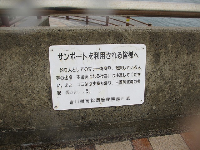 玉藻防波堤 2024.09.052024.10.12 記事内に広告が含まれています。 広告 付け根から先端方向(西側) 駐車スペース:ありトイレ:あり自動販売機:あり常夜灯:あり電線:なし係留船:-波除け:普通 付け根にある注意看板。駐車場から先端まではかなり離れているため、折りたたみ自転車があると便利 もう1枚。これができない釣り人が多いため、釣り禁止区域が増えています! ついでに注意看板をもう1枚。これも大事! 付け根から先端向き(東側) 付け根から東向き。桟橋は立入禁止のため付け根にフェンスが設置されています 玉藻防波堤付け根から見た東の桟橋付け根周辺 別角度からもう1枚 東の桟橋付け根にはフェンスが設置されています 東の桟橋から東側は釣り禁止なので注意! 西側付け根から南向き 同上の波打ち際 南の「サンライズテラス」から北の「玉藻防波堤」方向 救命具が設置されているので安心。使いたくはないですが・・・ テラスにはスロープがありました かわいいベンチ 海側の柵(手すり)にはネットが設置されており・・・↓ イノシシが上陸・・・テレビで見たことありますが・・・ 玉藻防波堤香川県高松市サンポート 前の釣り場-G地区 次の釣り場-新北町 関西海釣りドライブマップ(四国東部(香川県津田〜徳島県全) [ つり人社 ]